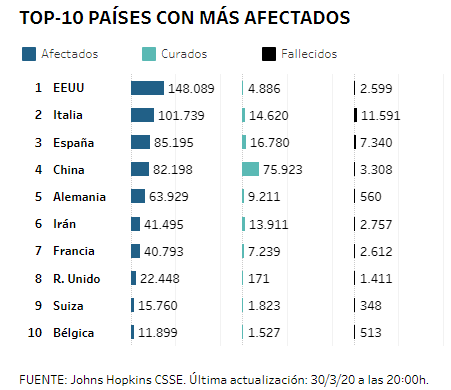 Fuentes: https://www.elmundo.es/ciencia-y-salud/salud/2020/03/02/5e5cd4ebfc6c83632e8b4644.html https://www.publico.es/tremending/2020/03/14/coronavirus-viva-la-sanidad-publica-todos-los-rincones-de-espana-se-rinden-a-los-sanitarios-con-emotivos-y-largos-aplausos-desde-las-ventanas/ https://www.bbc.com/mundo/noticias-internacional-51371640 https://cuidateplus.marca.com/bienestar/2020/03/03/-son-vulnerables-infeccion-nuevo-coronavirus-172255.html